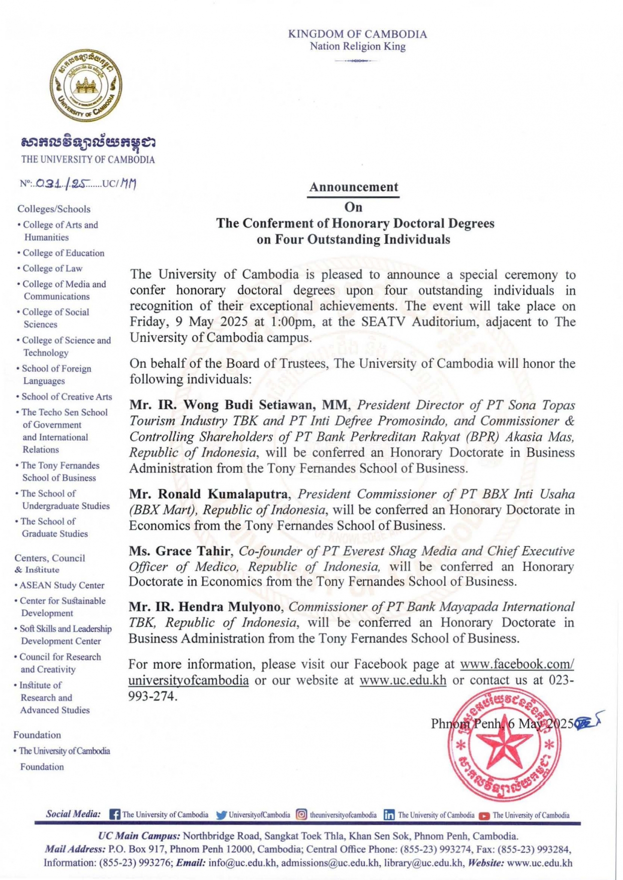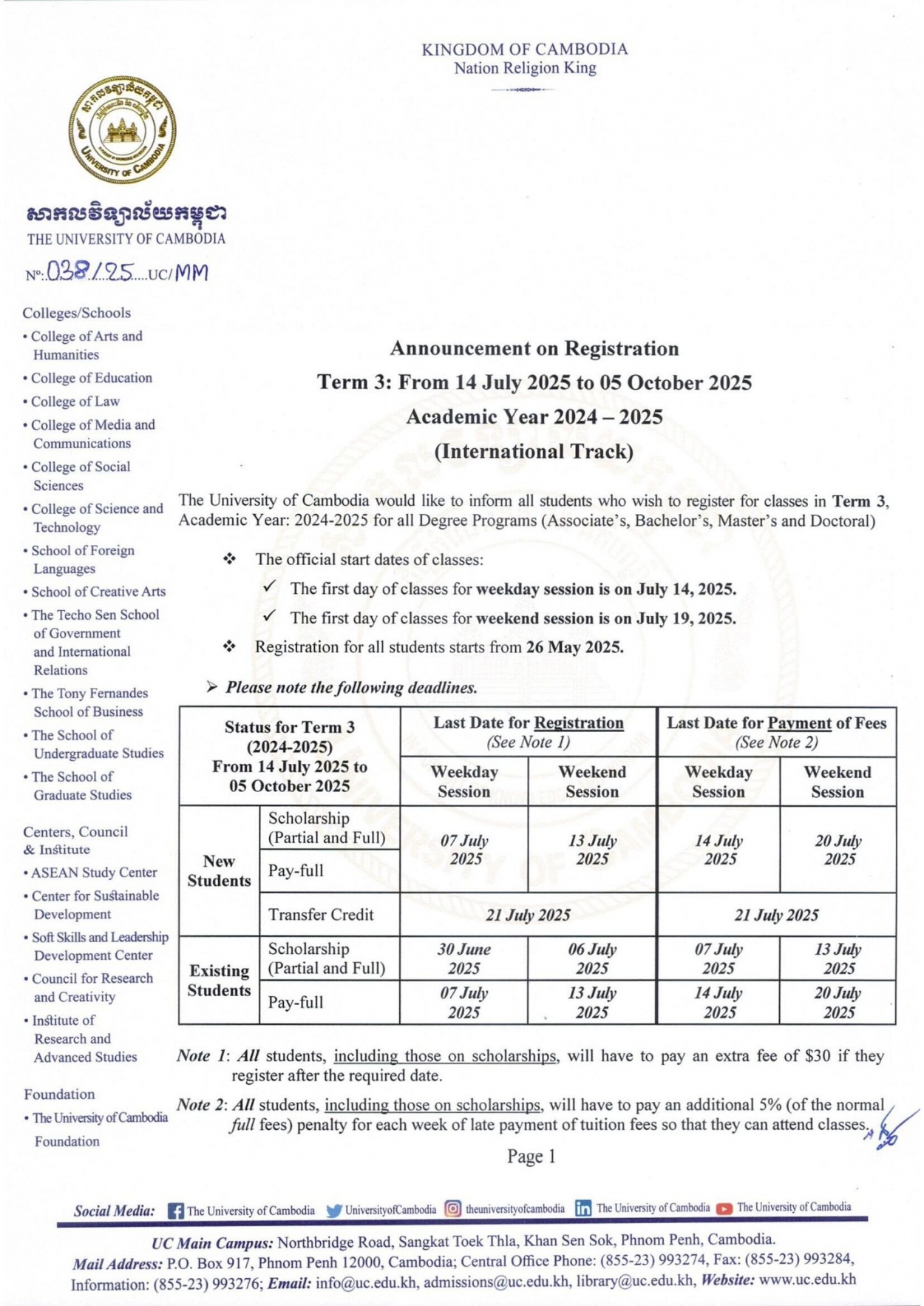 • Update Announcement on Registration Term 3: From 14 July 2024 to 06 October 2025 Academic Year 2024−2025 on UC website and UC foundation website