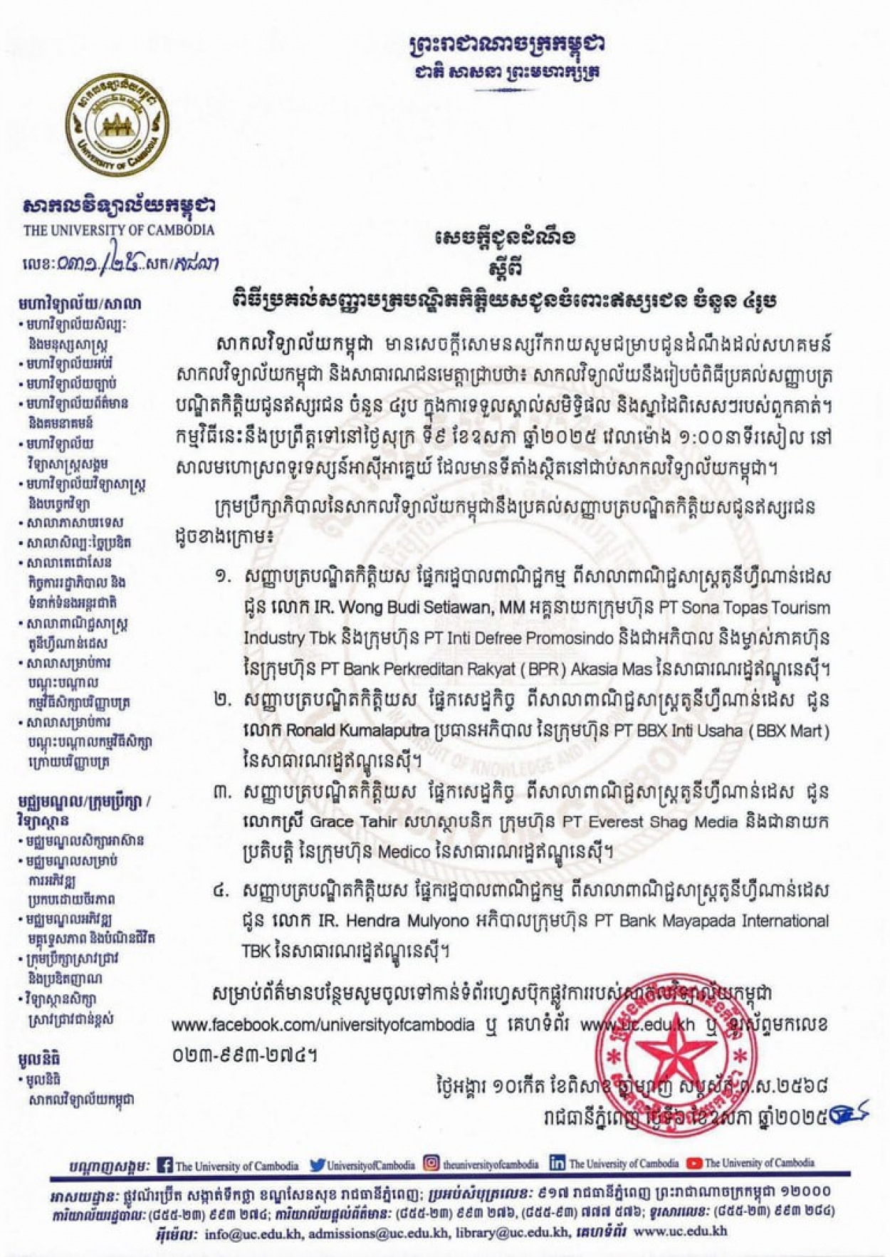 សេចក្តីជូនដំណឹងស្ដីពីពិធីប្រគល់សញ្ញា បត្របណ្ឌិតកិត្តិយសជូនចំពោះ ឥស្សរជនចំនួន៤រូប