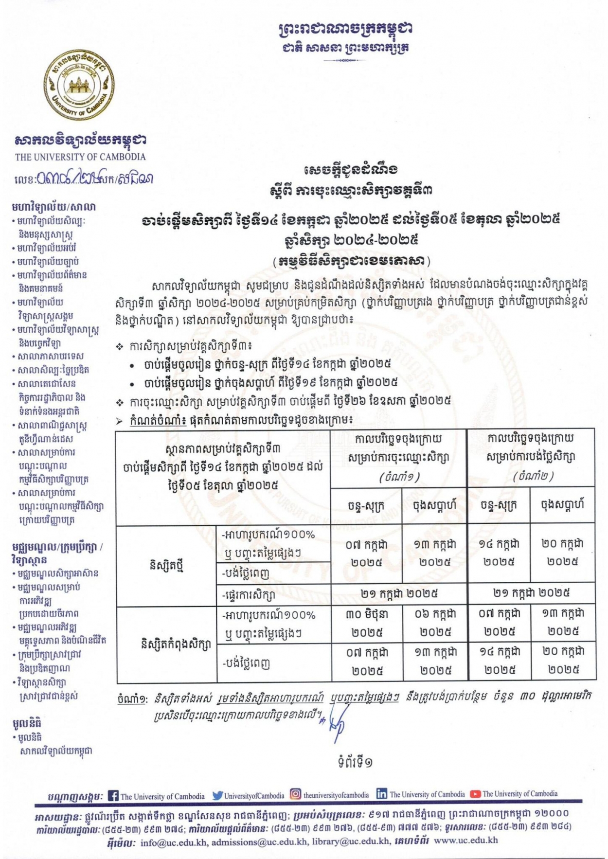 សេចក្ដីជូនដំណឹងស្ដីពីការចុះឈ្មោះសិក្សាវគ្គទី៣ ចាប់ផ្តើមសិក្សាពី ថ្ងៃទី១៤ ខែកក្កដា ឆ្នាំ២០២៥ ដល់ថ្ងៃទី០៦ ខែតុលា ឆ្នាំ២០២៥ ឆ្នាំសិក្សា ២០២៤−២០២៥
