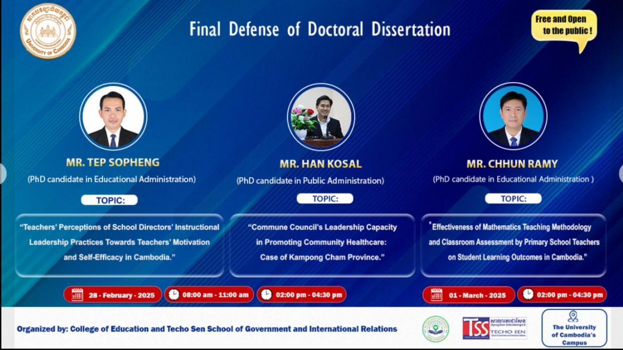 The University of Cambodia (UC) has received approval from the Ministry of Education, Youth and Sports (MoEYS) to conduct final dissertation defenses for three doctoral candidates from February 28 to March 1, 2025. The details of the candidates and their dissertation topics are, as follows: