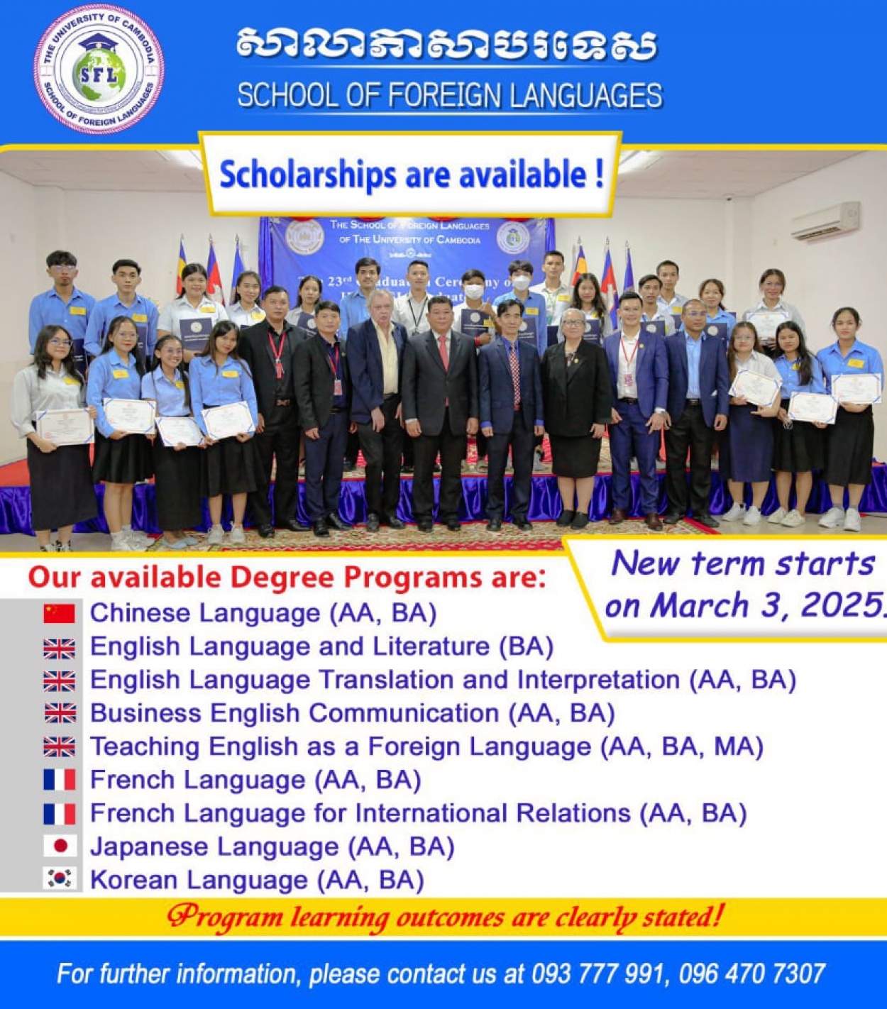 The School of Foreign Languages (SFL) is now accepting new students for AA, BA and MA programs for the upcoming term 2, Academic Year 2024-2025, which will start on March 3, 2025. For more information, please contact us at 096 470 7307 or 093 777 991. Thank you.