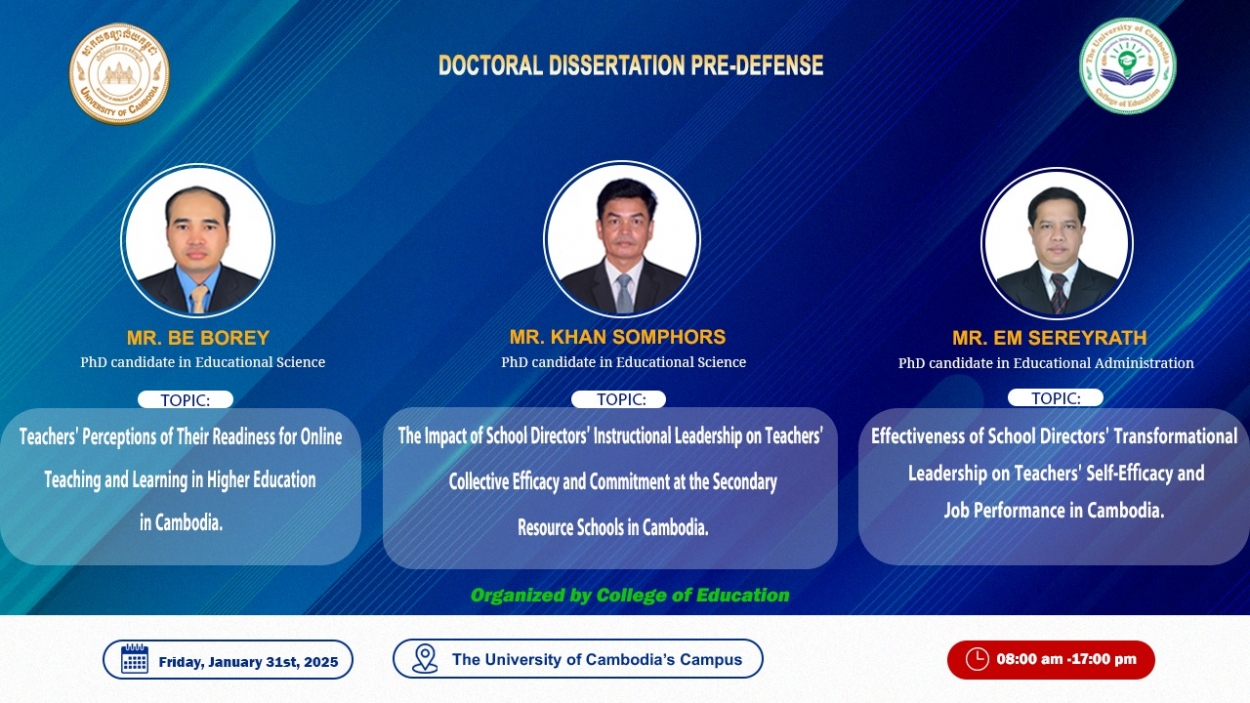 College of Education of The University of Cambodia (UC) is pleased to announce a Doctoral Dissertation Pre-Defense for three doctoral candidates. Participation in this pre-defense is welcome.