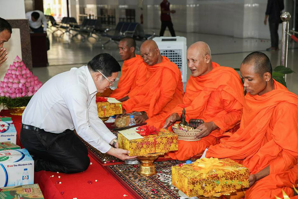 Buddhist Blessing Ceremony at The University of Cambodia (UC) on the occasion of the birthday of UC Founder & President, Dr. Kao Kim Hourn. The ceremony was conducted by Samdech Preah Vanaroth Nay Chroek, along with other Buddhist monks, throughout the UC main building, from the ground floor to the 11th floor. Presence at this ceremony included LCT Khem Rany, Director-General of SEATV and Member of UC Board of Trustees and Vice President for General Affairs; HE Samraing Kamsan, Member of UC Board of Trustees; other staff members from both UC and SEATV.