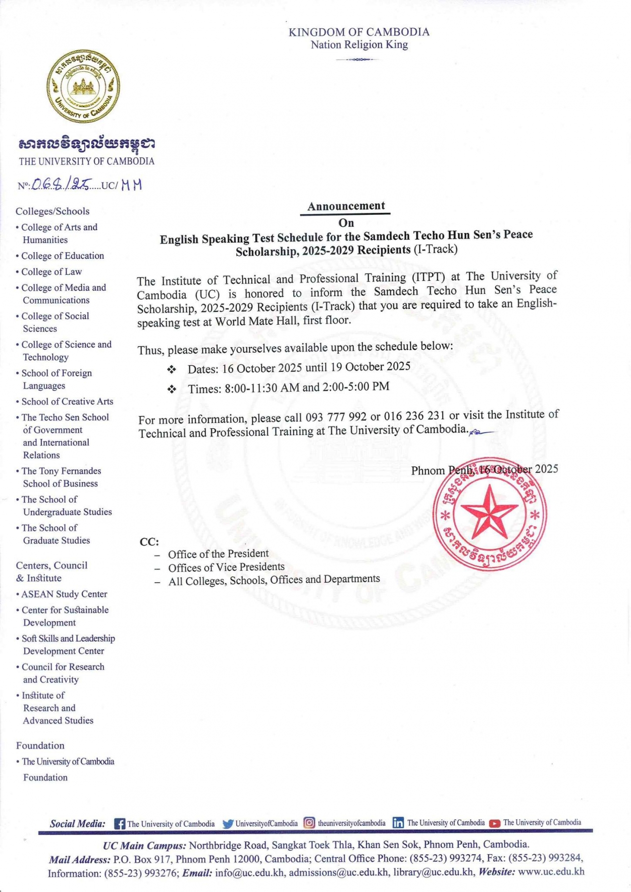 Announcement on English Speaking Test Schedule for Samdech Techo Hun Sen's Peace Scholarship, 2025-2029 Recipients (I-Track)