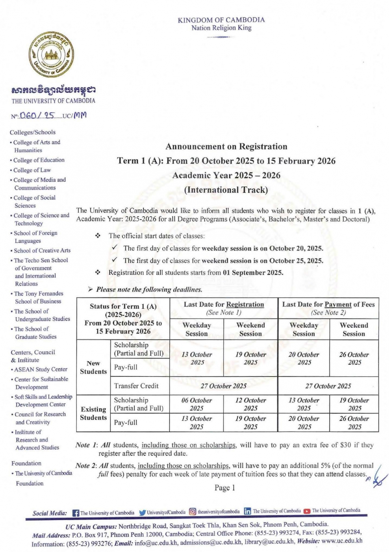 សេចក្តីជូនដំណឹង ស្តីពី ការចុះឈ្មោះសិក្សាវគ្គទី១ (A) ចាប់ផ្តើមការសិក្សាពី ថ្ងៃទី២០ ខែតុលា ឆ្នាំ២០២៥ ដល់ថ្ងៃទី១៥ ខែកុម្ភៈ ឆ្នាំ២០២៦ ឆ្នាំសិក្សា ២០២៥-២០២៦ (កម្មវិធីសិក្សាជាខេមរភាសា)