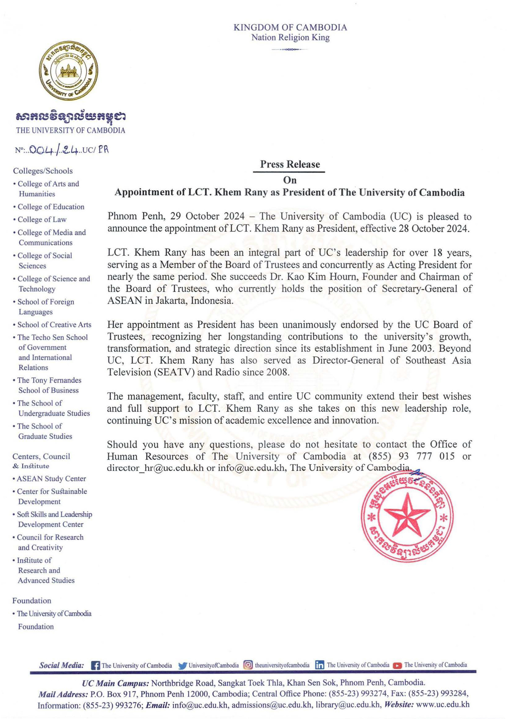 Press Release On Appointment of LCT. Khem Rany as President of The University of Cambodia