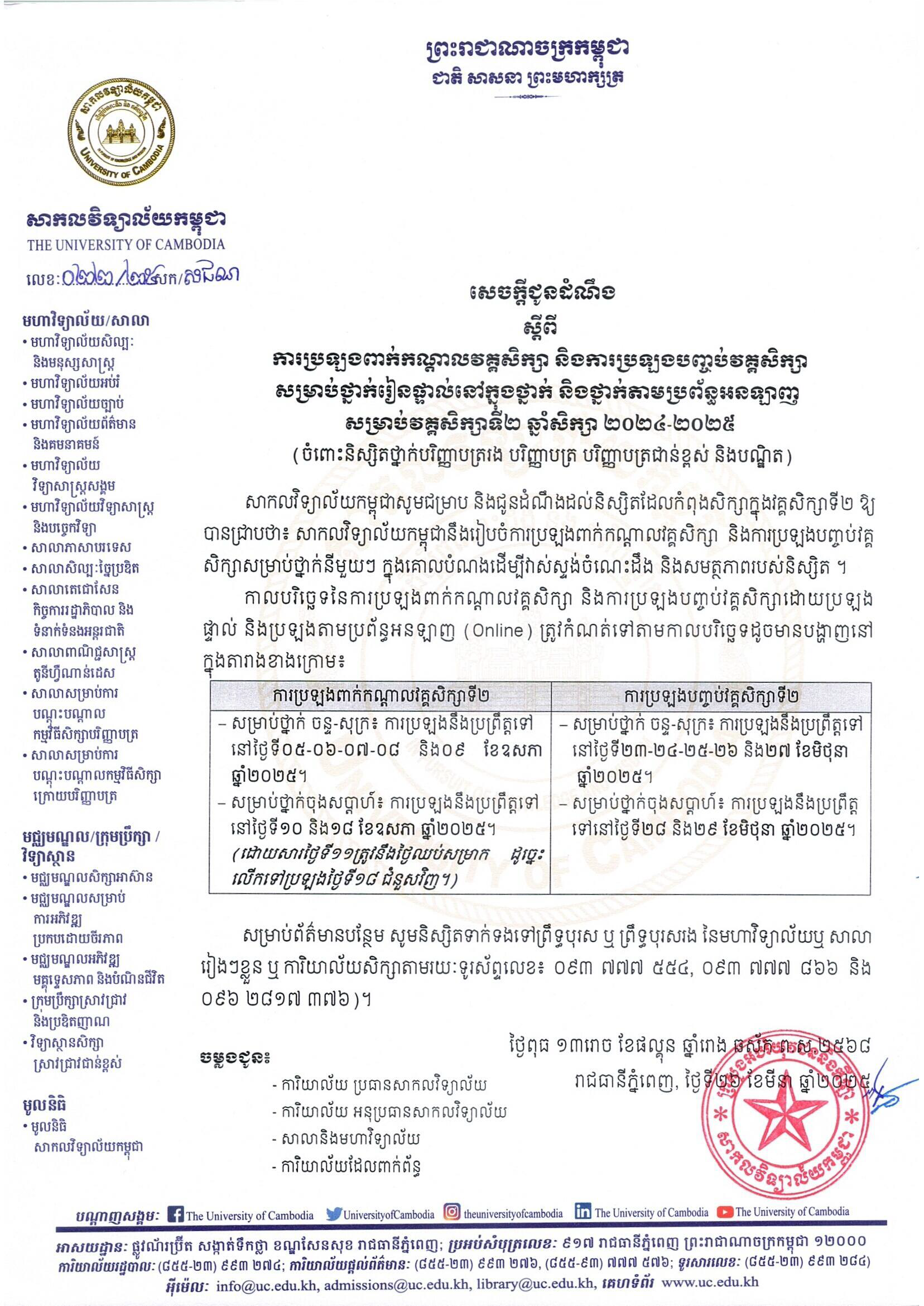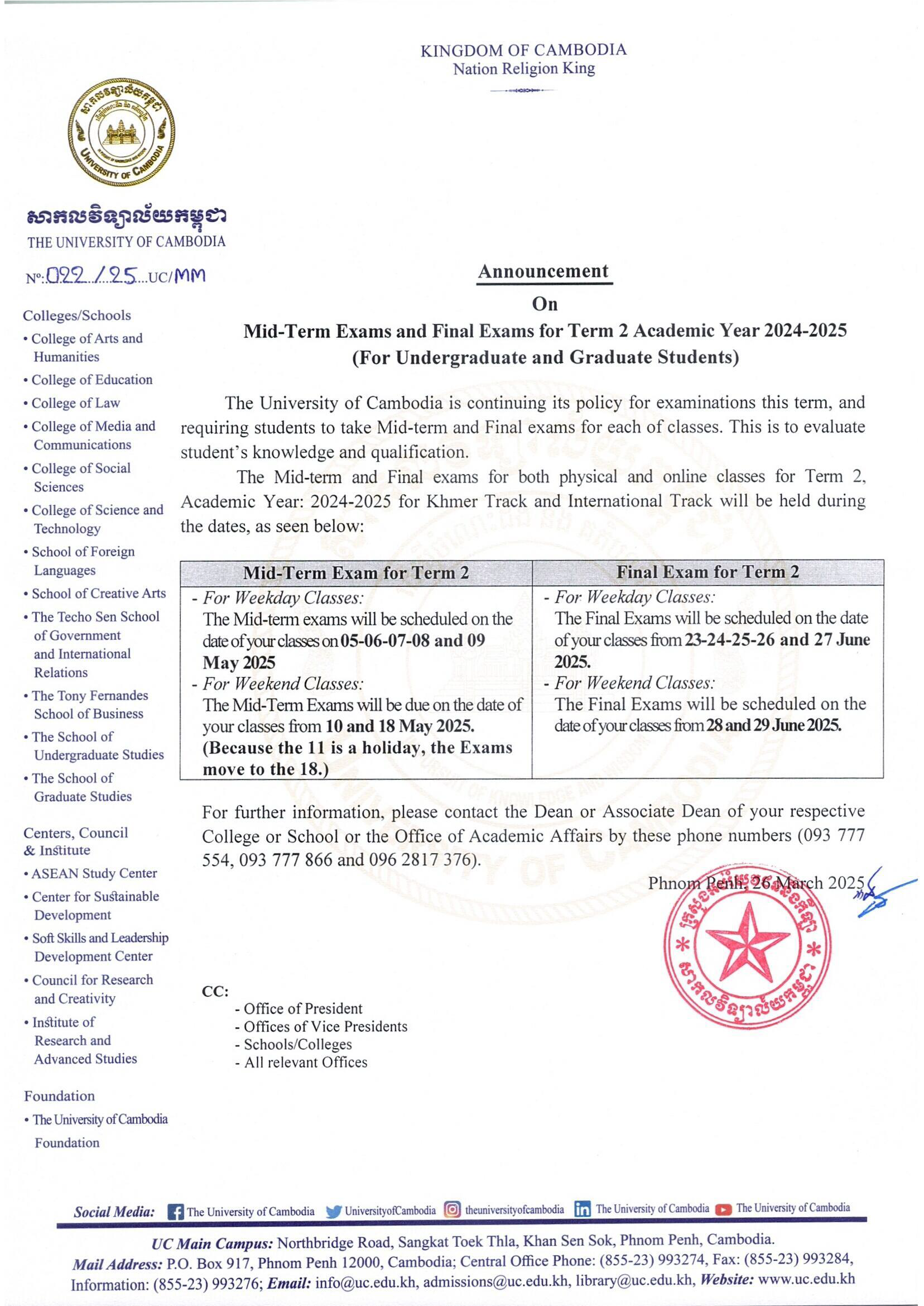 Announcement on Mid-Term Exams and Final Exams for Term 2 Academic Year 2024-2025 (For Undergraduate and Graduate Students)