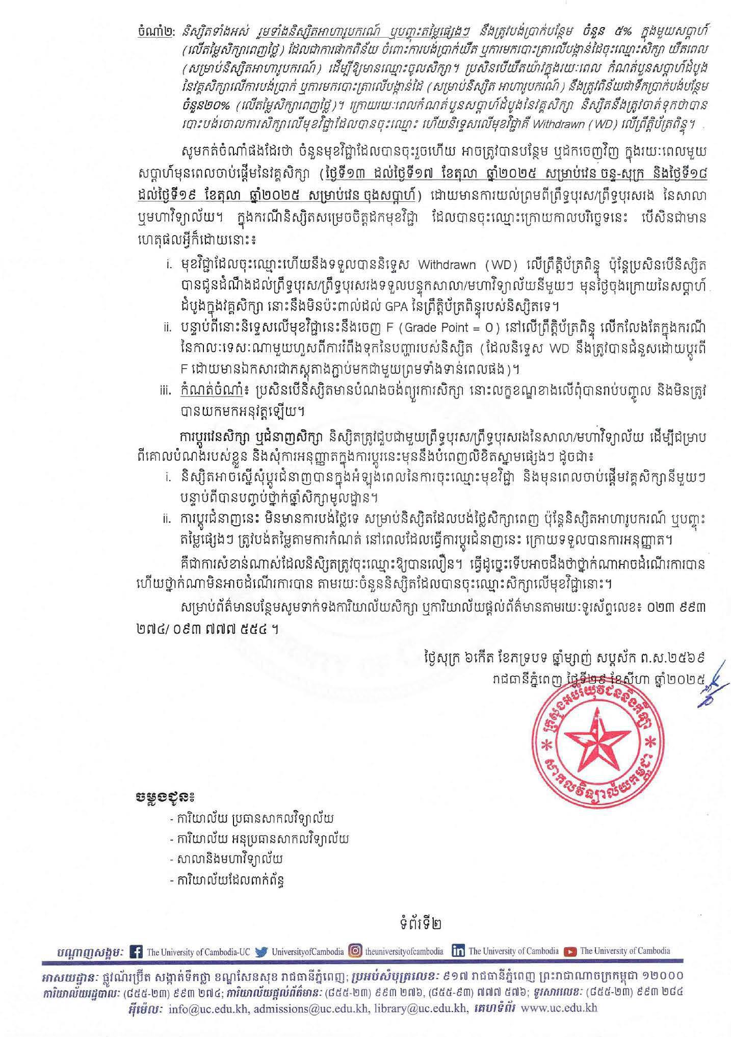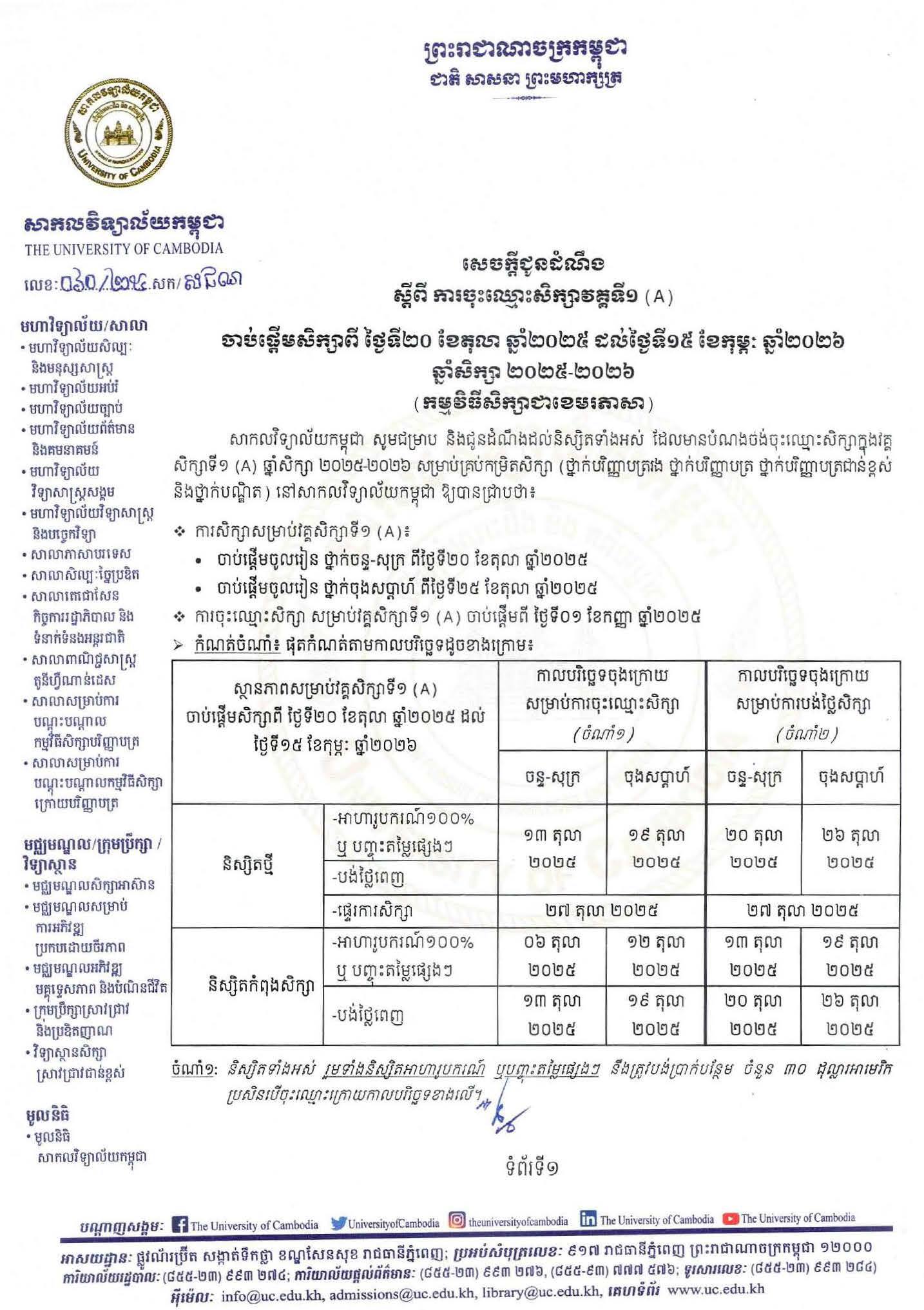 សេចក្តីជូនដំណឹង ស្តីពី ការចុះឈ្មោះសិក្សាវគ្គទី១ (A) ចាប់ផ្តើមការសិក្សាពី ថ្ងៃទី២០ ខែតុលា ឆ្នាំ២០២៥ ដល់ថ្ងៃទី១៥ ខែកុម្ភៈ ឆ្នាំ២០២៦ ឆ្នាំសិក្សា ២០២៥-២០២៦ (កម្មវិធីសិក្សាជាខេមរភាសា)